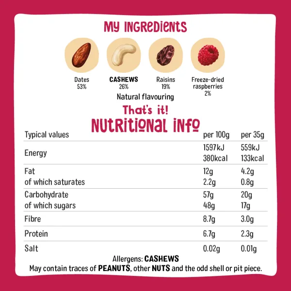 Dates (53%), cashews (26%), raisins (19%), freeze-dried raspberries (2%), natural flavouring.