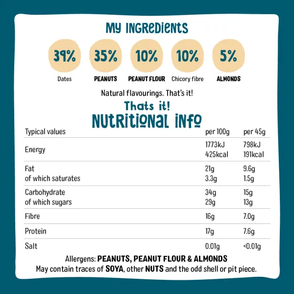100% natural ingredients, no added sugar, raw cold pressed, vegan, gluten free, dairy free, source of fibre, no colouring or preservatives