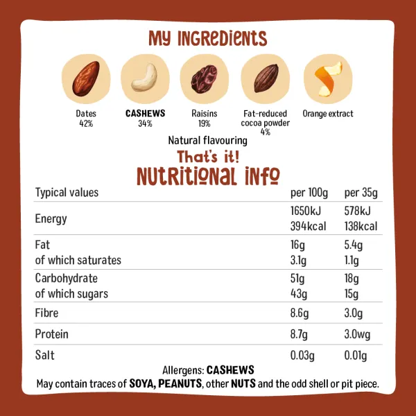 Dates (42%), cashews (34%), raisins (19%), fat-reduced cocoa powder (4%), orange extract, natural flavouring