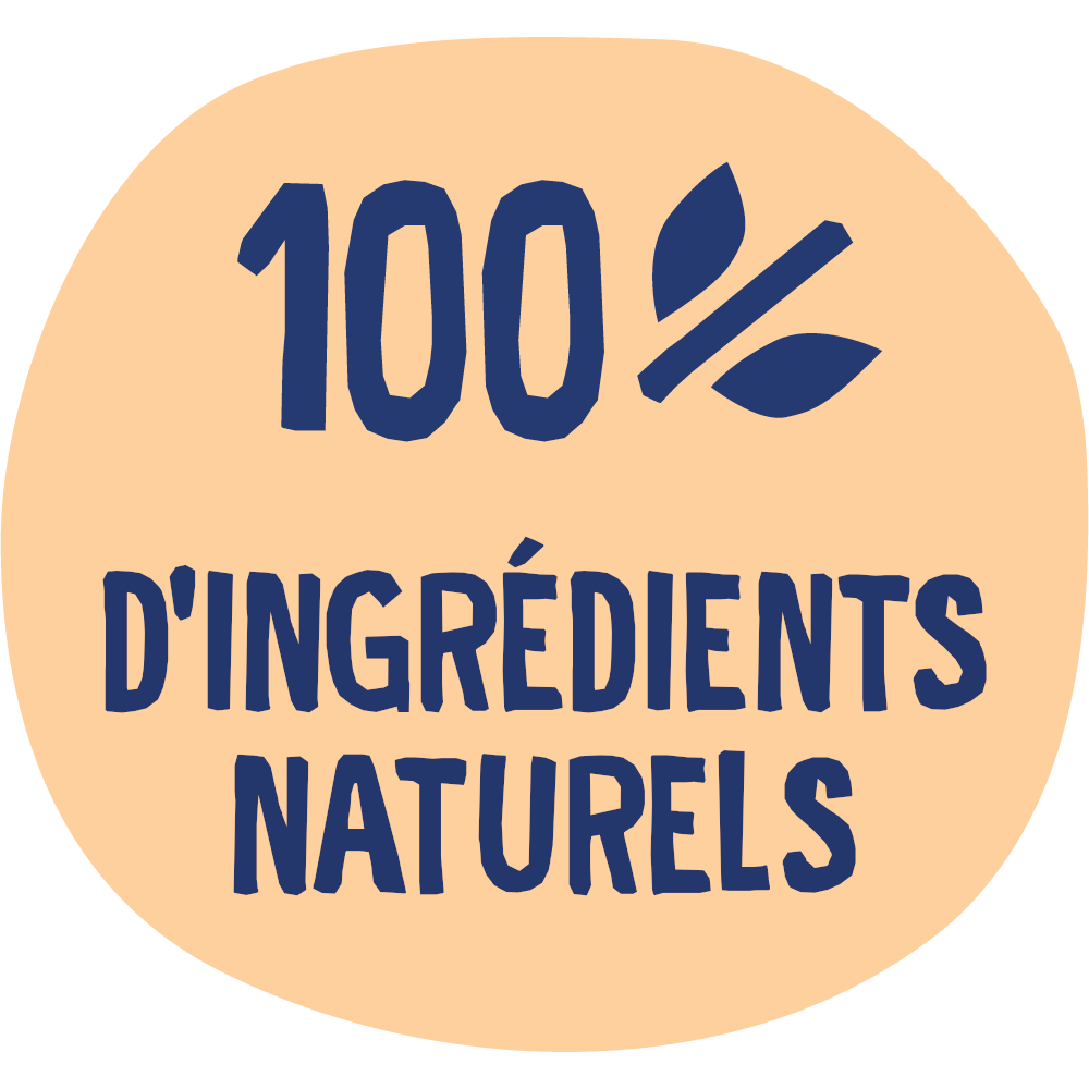 100 % d'ingrédients naturels, sans sucre ajouté, pressés à froid, vegan, sans gluten, sans lait, source de fibres, sans colorants ni conservateurs.