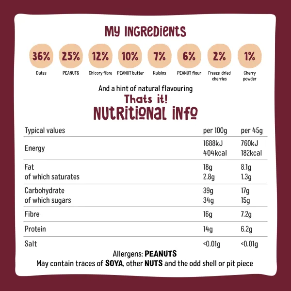 Heldere, smaakvolle kersen worden gecombineerd met knapperige noten in deze heerlijke proteïnereep. Gemaakt met natuurlijke, veganistische ingrediënten en zonder toegevoegde suikers, koudgeperst zonder verhitting voor een pure smaak en textuur. Een fruitige twist met een proteïneboost - wat wil je nog meer?